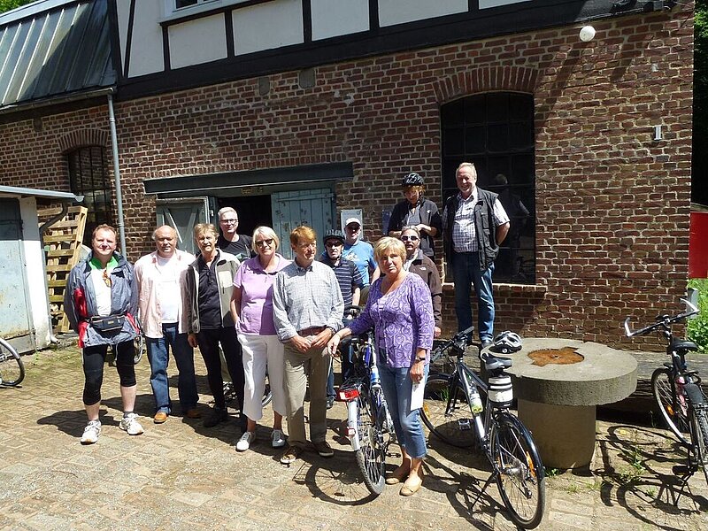 Nach einer kurzen Weiterfahrt war ein Stopp im Strandcafe „Kohlfurther Brücke“ am Wupperufer eingeplant. Auch hier passte der Halt wie am Manuelskotten: Es fing kräftig an zu regnen, doch unter den großen Sonnenschirmen blieben wir trocken. Als der Himmel wieder aufriss, bestiegen wir schnell die Räder zur Weiterfahrt. Hielten aber bald wieder an, um auf dem unerwarteten offenen Gelände der "Bergischen Museumsbahnen e.V." an der Kohlfurther Brücke Eindrücke aus der Restaurierung von alten Straßenbahnen zu erfahren. Unangemeldet, da normalerweise Samstags geschlossen, durften wir trotzdem in die Hallen des Betriebshofes gehen und erhielten sogar spontan einen Kurzvortrag über das Vereinsleben und die alten restaurierten Museumsbahnen. Nach diesem nicht eingeplanten aber hochinteressanten Zwischenstopp radelten wir entlang der Wupper zurück zum Ausgangspunkt, dem Wuppertaler Zoo und wurden dort im Ziel von Gerd und Elisabeth Langner mit einem kleinen „Begrüßungscocktail“ empfangen. Hier im "Alten Kuhstall" haben wir uns stärken können und waren uns einig: Eine absolut tolle Radtour ist auch im Bergischen Land möglich!