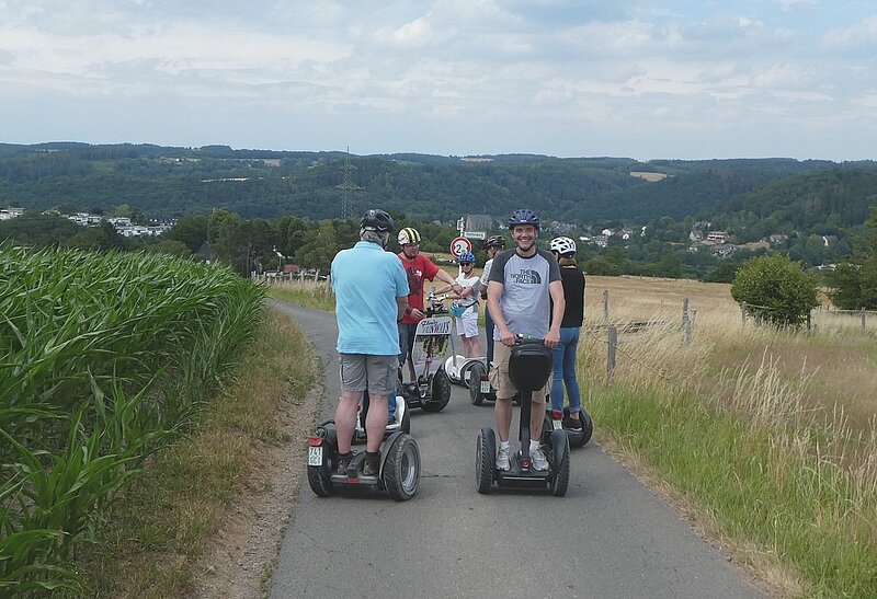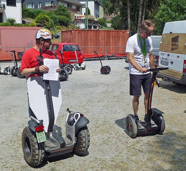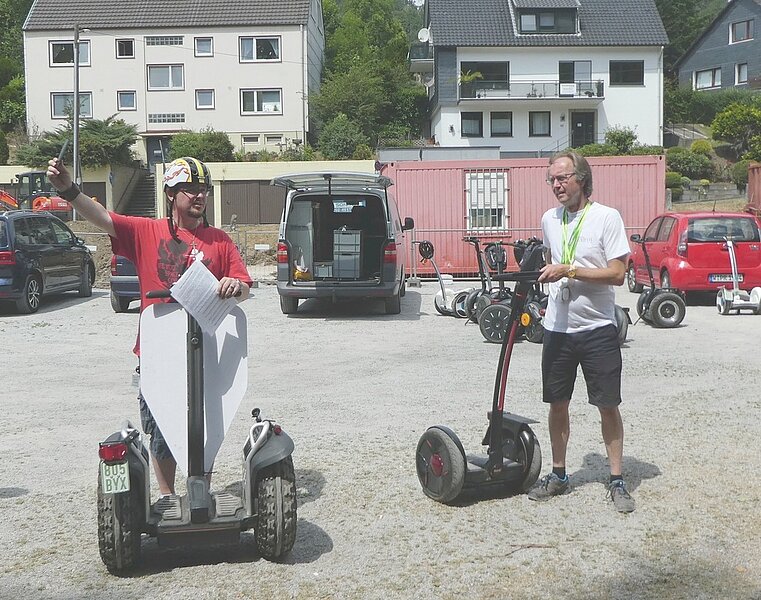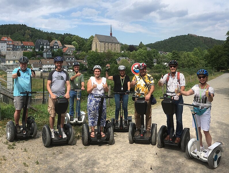Zu einer besonderen Entdeckungstour hat der VDV-Bezirk Wuppertal seine Mitglieder nach Wuppertal-Beyenburg geladen. Dieser Einladung gefolgt waren 15 VDV´ler (incl. Partner). Hier wurden am frühen Nachmittag die Funways entgegengenommen. Die beiden Tourguides der Fa. „Flender Funways“ wiesen uns in die Handhabung der Funways fachmännisch ein. Wichtig zur Fortbewegung ist die Gewichtsverlagerung auf dem Board. Sensoren aus der Flugzeugtechnologie erkennen die minimalen Gewichtsverlagerungen und beschleunigen oder bremsen das Funway. Die Richtungsänderung wird mit der Lenkstange durchgeführt. Relativ schnell waren wir mit der Steuerung vertraut und konnten in 2 Gruppen unsere „KulTour“ in Wpt.-Beyenburg starten. Bei herrlichem Wetter war der erste Halt die Klosterkirche Sankt Maria Magdalena. Schon im Jahr 1298 wurde erstmalig eine Kapelle erwähnt, die den Kreuzbrüdern vom Domprobst in Köln geschenkt wurde. Das Kloster stand im 15. Jahrhundert in voller Blüte. Heute ist es das letzte Kloster des Kreuzherren-Ordens in Deutschland. Das Kloster liegt am rheinischen Jakobsweg, der von Dortmund über Köln nach Aachen führt.