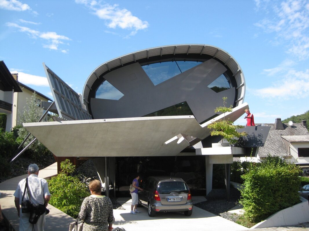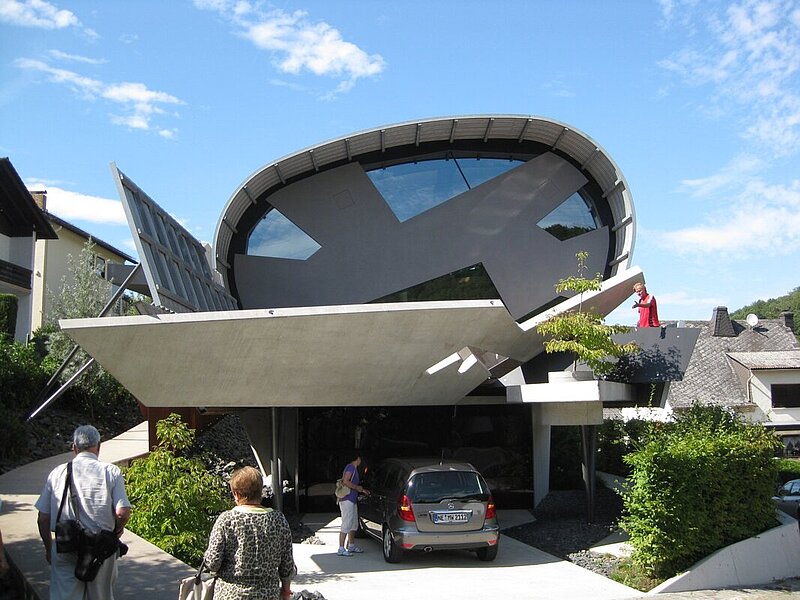 Nach dieser kurzweiligen Führung – die eingeplante Zeit war schon lange überschritten – trafen wir uns mit dem Markscheider Uwe Mathes vor dem Büro seines Bruders, dem ÖbVI Jörg Mathes. Nach der Begrüßung und der neuen Zeitplanung haben wir das ÖbVI Büro besichtigen können. Jörg Mathes führte uns durch sein Büro, das mit zurzeit 35 Bediensteten zu einem der größeren Vermessungsbüros in Deutschland zählt. Er stellte uns seine aktuellen und bereits durchgeführten Aufträge vor und erklärte uns, mit welchem Aufwand er die Kundenakquise ausführt, um sein Büro wirtschaftlich führen zu können. Nach dem anschließenden Mittagessen besichtigten wir die Privathäuser der Brüder Mathes in Braunfels, die von dem Architekten Peter Gronych entworfen worden sind. Diese Häuser sind so außergewöhnlich geplant und gebaut, dass die Besichtigung schon als Highlight gelten darf.
