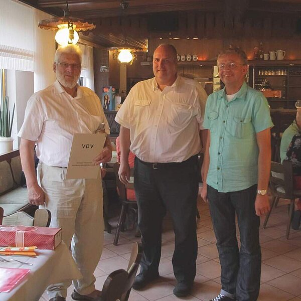 Das Tagesprogramm wurde durch die Kaffeetafel im Garten der Eheleute Thiemann abgerundet. Von dort fuhren wir in ein Lokal zum Abendessen und gemütlichen Ausklang, bei dem Herr Ingulf Thiemann (der krankheitsbedingt nicht bei der Bundesmitgliederversammlung in Schwerin anwesend sein konnte) um für seine 50-jährige Mitgliedschaft im VDV vom Bundesgeschäftsführer Herrn Burkhard Kreuter und dem Bezirksvorsitzenden Hessen-Mitte, Herrn Horst Gläsmann, würdig geehrt wurde. Diese Ehrung war das i-Tüpfelchen der gemeinsamen Wochenendfahrt nach Weilburg.