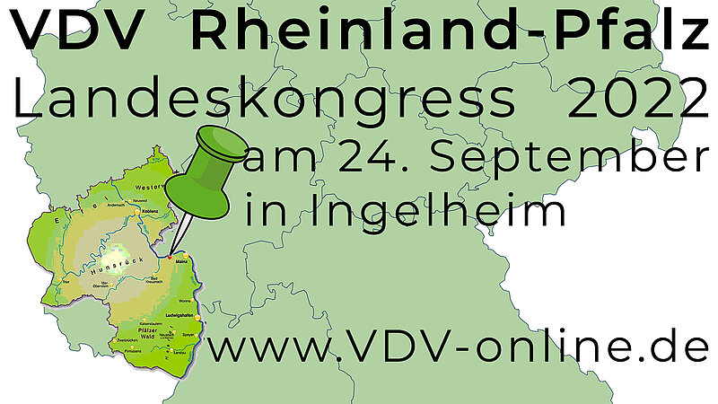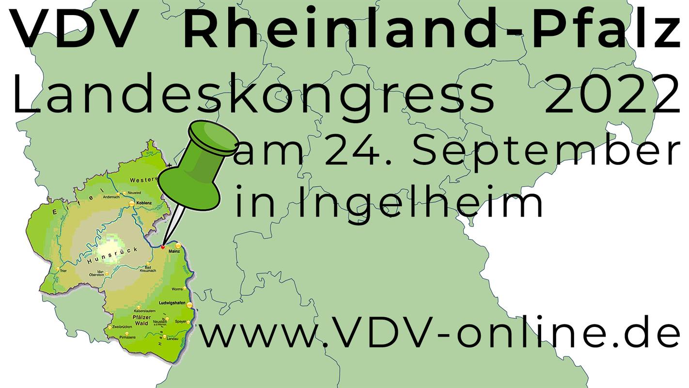 Der Landesvorstand VDV-Rheinland-Pfalz lädt alle Mitglieder, Freunde und Gäste recht herzlich zum Landeskongress am Samstag, 24.09.2022 nach Ingelheim ein und freut sich sehr, dass nach den durch Corona bedingten Verschiebungen und Ausfällen wieder ein persönliches Treffen möglich ist.