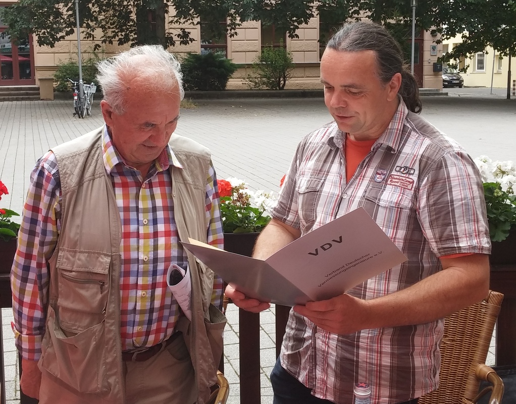 Gutes italienisches Essen, das eine oder andere kühle Getränk, und die Gelegenheit zu ausführlichen Gesprächen bildeten den Abschluss dieses gelungenen Nachmittages. VDV-Kollege Dipl.-Ing. Hans-Jürgen Matheja erhielt in diesem angenehmen Rahmen vom Bezirksvorsitzenden Dipl.-Ing. Tobias Höhne die silberne Mitgliedsnadel für 25 Jahre VDV-Mitgliedschaft überreicht.