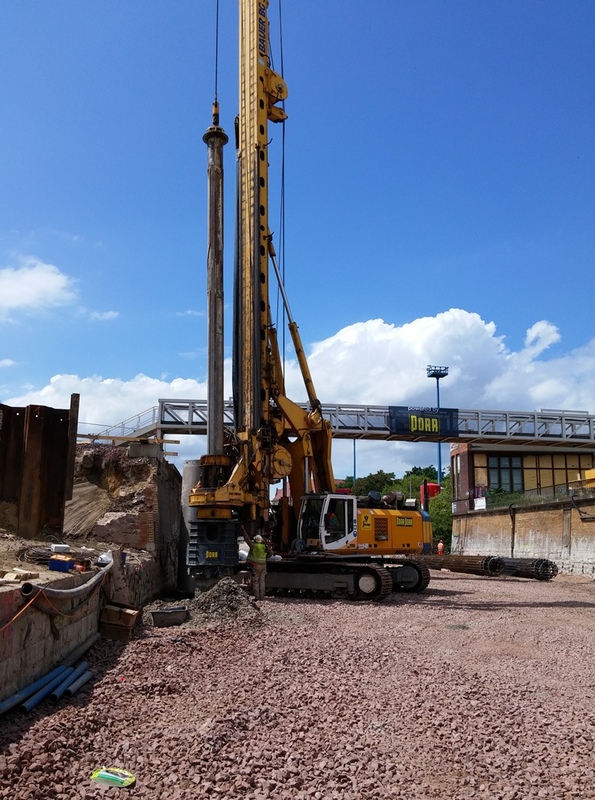 Dann ging es zu Fuß über die Baustelle. Wir kamen vorbei an einem großen Bohrer der entlang des Baufeldes Löcher bohrte, um Betonpfähle tief ins Erdreich zu platzieren. Diese werden zukünftig Teil der Außenwände des Tunnels. Eine weitere Maschine bohrte Löcher in vorhandenes, baufeldbegrenzendes Mauerwerk. Hierüber wird später über Hochdruck­injektionen das dahinter liegenden Erdreich stabilisiert.