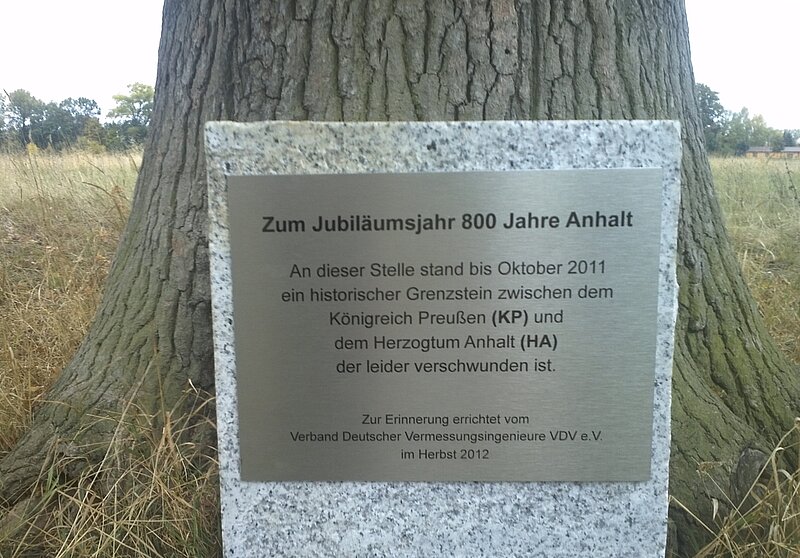 Im Frühjahr dieses Jahres wurde eine historische Sandsteinsäule an der ehemaligen Grenze zwischen dem Königsreich Preußen und dem Herzogtum Anhalt entwendet. Der Verlust wurde von Herrn Udo Franz vom Verein für anhaltische Landeskunde (VAL e.V.) bemerkt. Durch einen Bericht in der Lokalpresse erhielt der VDV-Landesverband Sachsen-Anhalt davon Kenntnis. Die Idee war geboren: ein Erinnerungsstein sollte zukünftig die Stelle markieren. Nach einigen Telefonaten mit den beiden begeisterten Hobby-Heimatforschern, dem örtlich zuständigen Ortsbürgermeister der Gemeinde Jeßnitz Herrn Helmut Ernst und Herrn Udo Franz wurde vereinbart, einen Erinnerungsstein zu setzen. Am 17.10.12 war es nun endlich soweit, der Erinnerungsstein konnte in der Nähe von Altjeßnitz gesetzt werden. Am Ortstermin nahmen neben Herrn Ernst und Herrn Franz auch der Pächter der Fläche sowie weitere VDV-Mitglieder und Gäste teil. Auch die Lokalpresse war vor Ort und berichtete über diese Aktion. Somit konnte die öffentliche Wahrnehmung unseres Verbandes wieder etwas verbessert werden.
