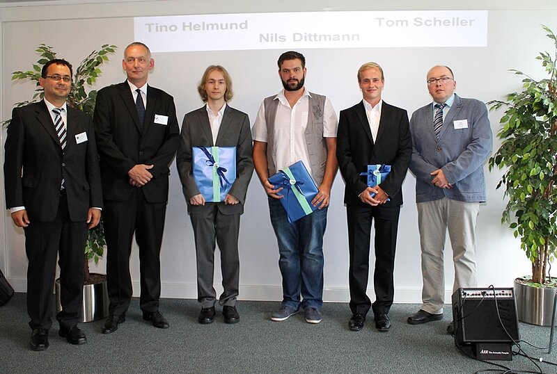 Die Auszeichnung der Jahrgangsbesten erfolgte durch die Vertreter der Berufsverbände (siehe Bild). Tino Helmund (Geomatiker, ÖbVI Wiese, Halberstadt) Nils Dittmann (Geomatiker, imp GmbH, Halle) und Tom Scheller (Vermessungstechniker, GeoTec - Tiemann GmbH, Kabelsketal) erhielten Buchpreise.