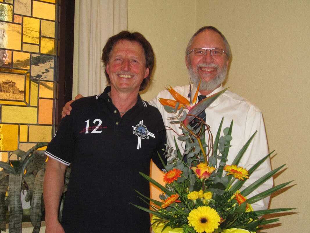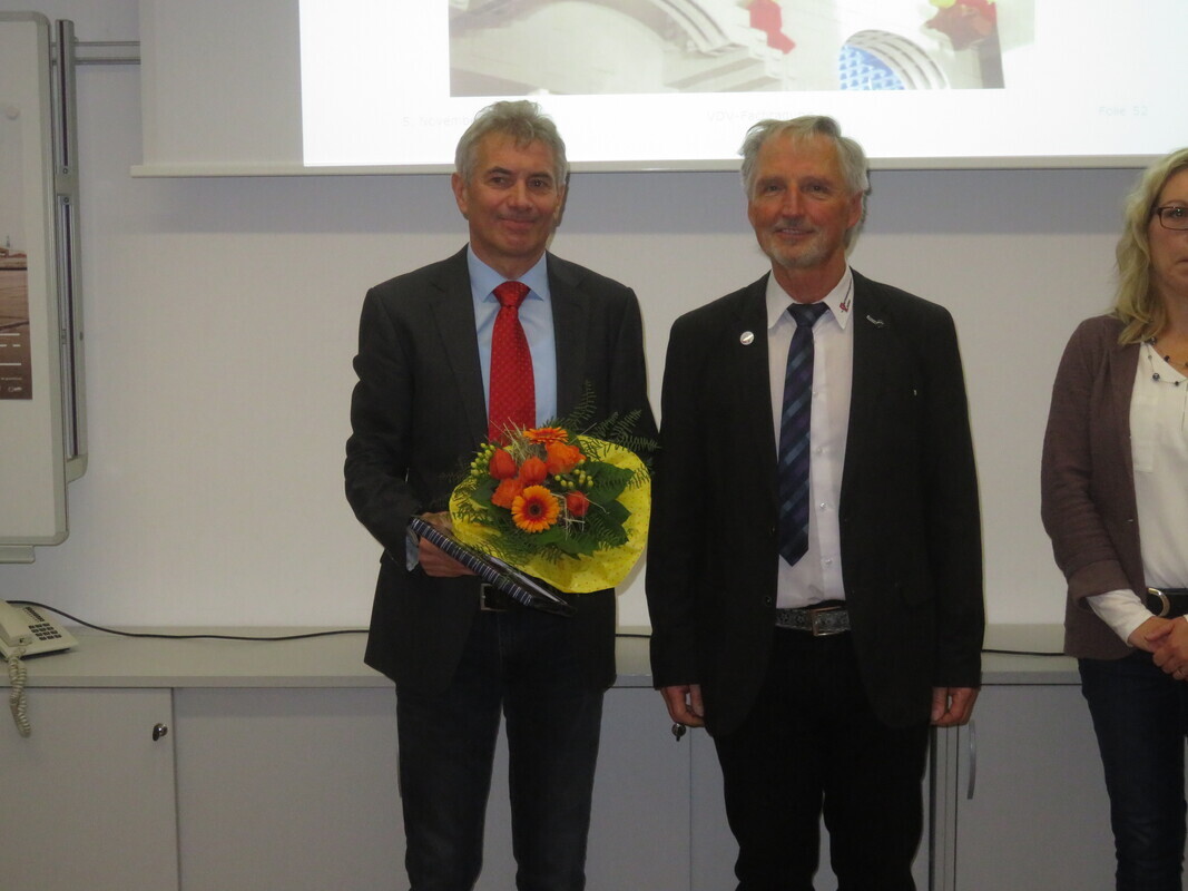 Am Donnerstag, den 18.04.2013 fand in Nossen die 2. Erweiterte Vorstandssitzung des Landesverbandes Sachsen im Verband Deutscher Vermessungsingenieure e.V. statt. Der an der HTW Dresden kürzlich im Rahmen eines Ehrenkolloquiums am 01.02.2013 vollzogene Generationswechsel der wissenschaftlichen Lehrtätigkeit durch die Verabschiedung von Herrn Prof. Christopher van Zyl fand nun auch beim VDV statt. Damit der unmittelbare Bezug zur Lehrtätigkeit und zu den Studierenden in der Fakultät Geoinformation weiter gegeben ist, stellte unser Referent für Hochschulangelegenheiten, Prof. Christopher van Zyl seine Funktion im VDV Landesvorstand Sachsen zur Verfügung. Der Landesvorsitzende Matthias Kaden würdigte seine langjährigen umfangreichen berufspolitischen Aktivitäten sowie sein unermüdliches Wirken in und für unseren Verband und um den Berufsnachwuchs. Auch ein großer Blumenstrauß durfte nicht fehlen. Prof. Christopher van Zyl dankte auf seine sprichwörtlich volksnahe und doch so weltoffene Art. Es wird uns sehr viel mehr als "Keep Well" fehlen. Lieber Chris, was geben wir Dir mit auf Deine weitere Weltreise: Bleib vor allem schön gesund und aktiv, zufrieden und glücklich in und mit Deiner Familie sowie selbstverständlich dem VDV weiter wohl gesonnen.