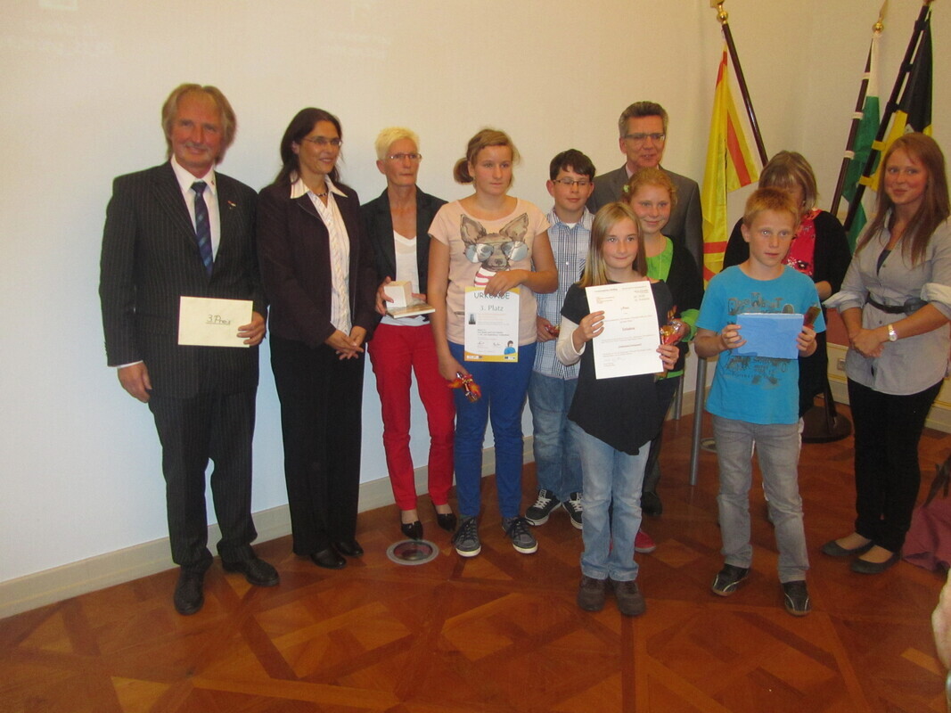 Auch der ausgelobte Schülerwettbewerb "Vor meiner Haustür steht ein Stein auf dem Feld ..." würdigt nachhaltig die Leistungen der Königlich Sächsischen Triangulation von 1862-1890. Alle am Wettbewerb beteiligten Schüler erstellten mit ihren Lehrern sehr interessante Projekte zur Landesvermessung durch Triangulation. Die Schüler der Klassen 5 bis 10 konnten dabei ihr mathematisches Wissen am Beispiel der kursächsischen Landesvermessung praxisnah anwenden und erweitern. Im Namen und Beisein des Schirmherren, dem Bundesminister und Bundestagsabgeordneten Herrn Dr. Thomas de Maiziere fand am Freitag, dem 21.09.2012, 15:00 Uhr im Rathaus zu Großenhain, im Sitzungssaal am Hauptmarkt die Präsentationen und Auszeichnungen der besten Beiträge des Schülerwettbewerbes statt.