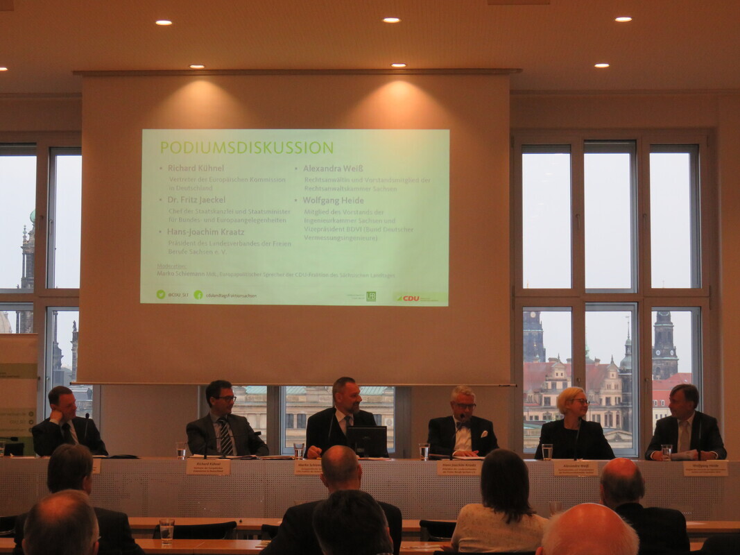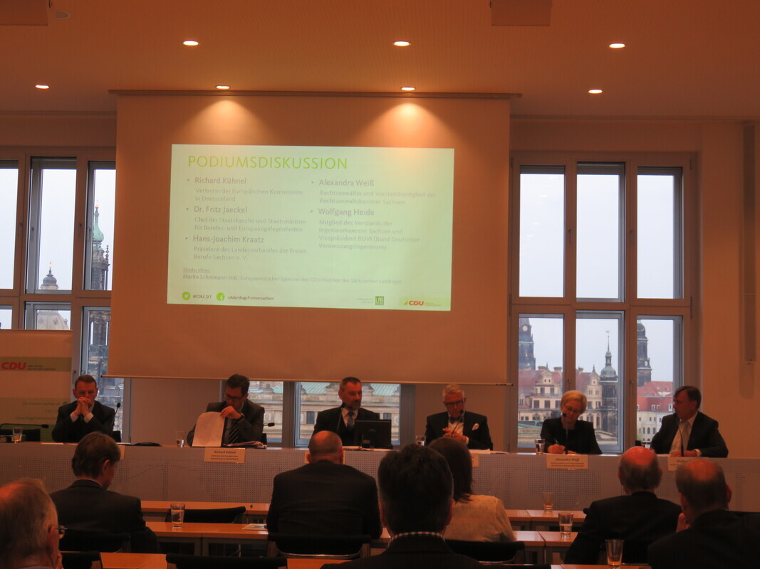 Beim Europapolitischen Forum der CDU-Landtagsfraktion im Freistaat Sachsen und dem Landesverband der Freien Berufe bestand die Möglichkeit, diesbezüglich auch mit den Geo-Berufsverbänden, so dem BDVI und dem VDV ins Gespräch zu kommen. Dazu ergingen von den Herren Frank Kupfer, MdL, Vorsitzender der CDU-Fraktion des Sächsischen Landtages und Hans-Joachim Kraatz, Präsident des Landesverbandes der Freien Berufe Sachsen e. V. hier zitierte Einladungen für den 27.04.2017, ab 17:30 Uhr in den Sächsischen Landtag.