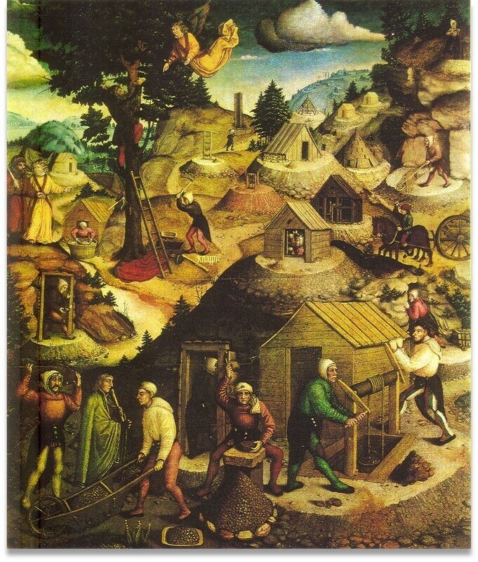 Im Mittelalter wurden die Schächte räumlich sehr nahe beieinander geteuft. Auch in Schneeberg war das so – überliefert ist, dass auf dem Schneeberger Stadtberg einmal über einhundert Göpel (Förderhaspel) gestanden haben sollen. Man kann das heute noch gut anhand der Darstellungen von Hans Hesse am Annaberger Bergaltar nachvollziehen.