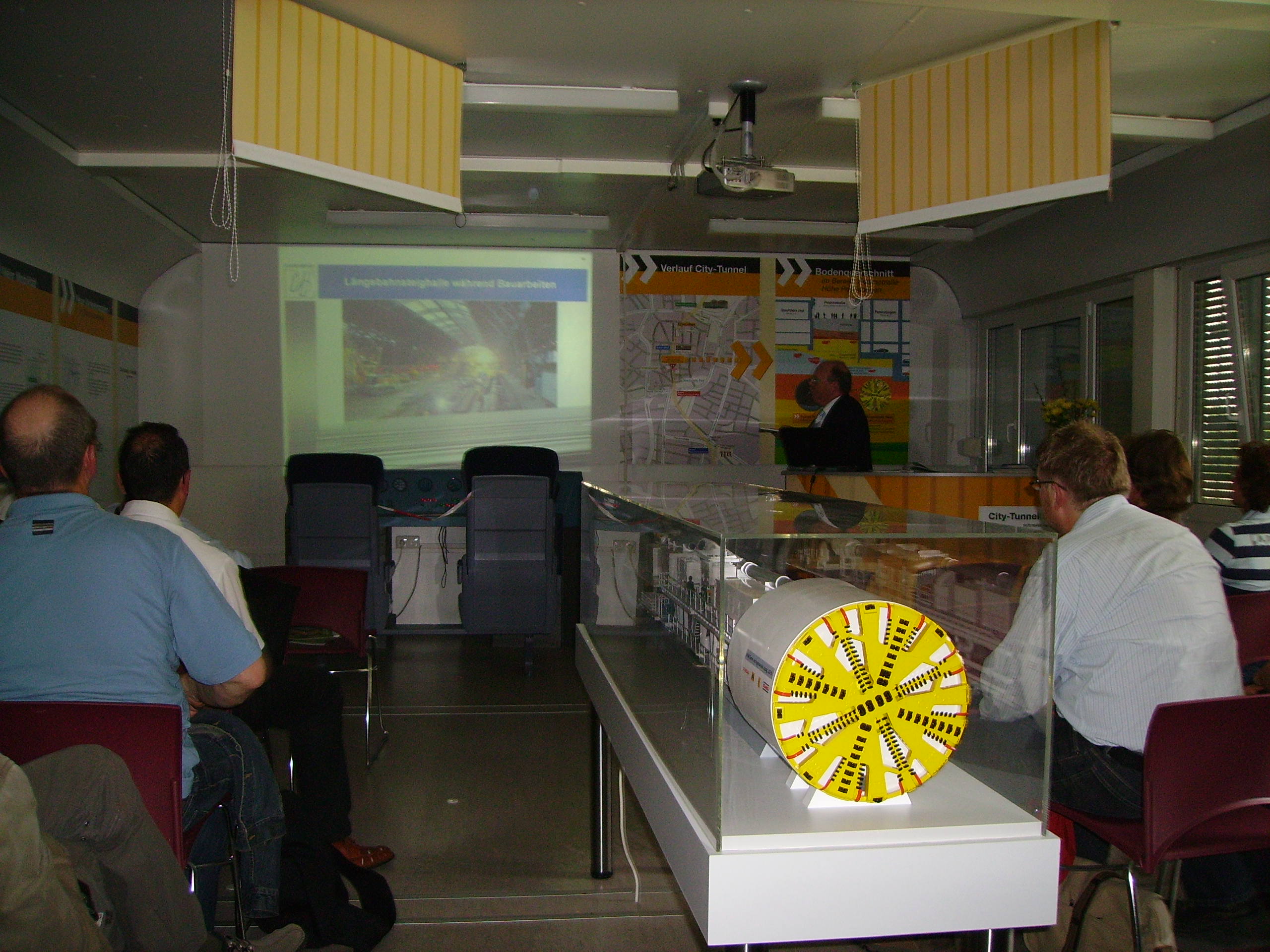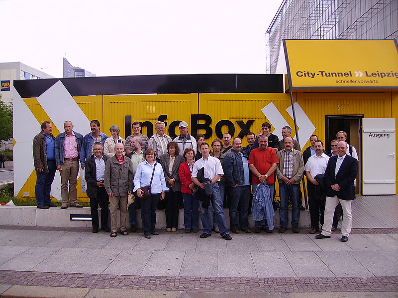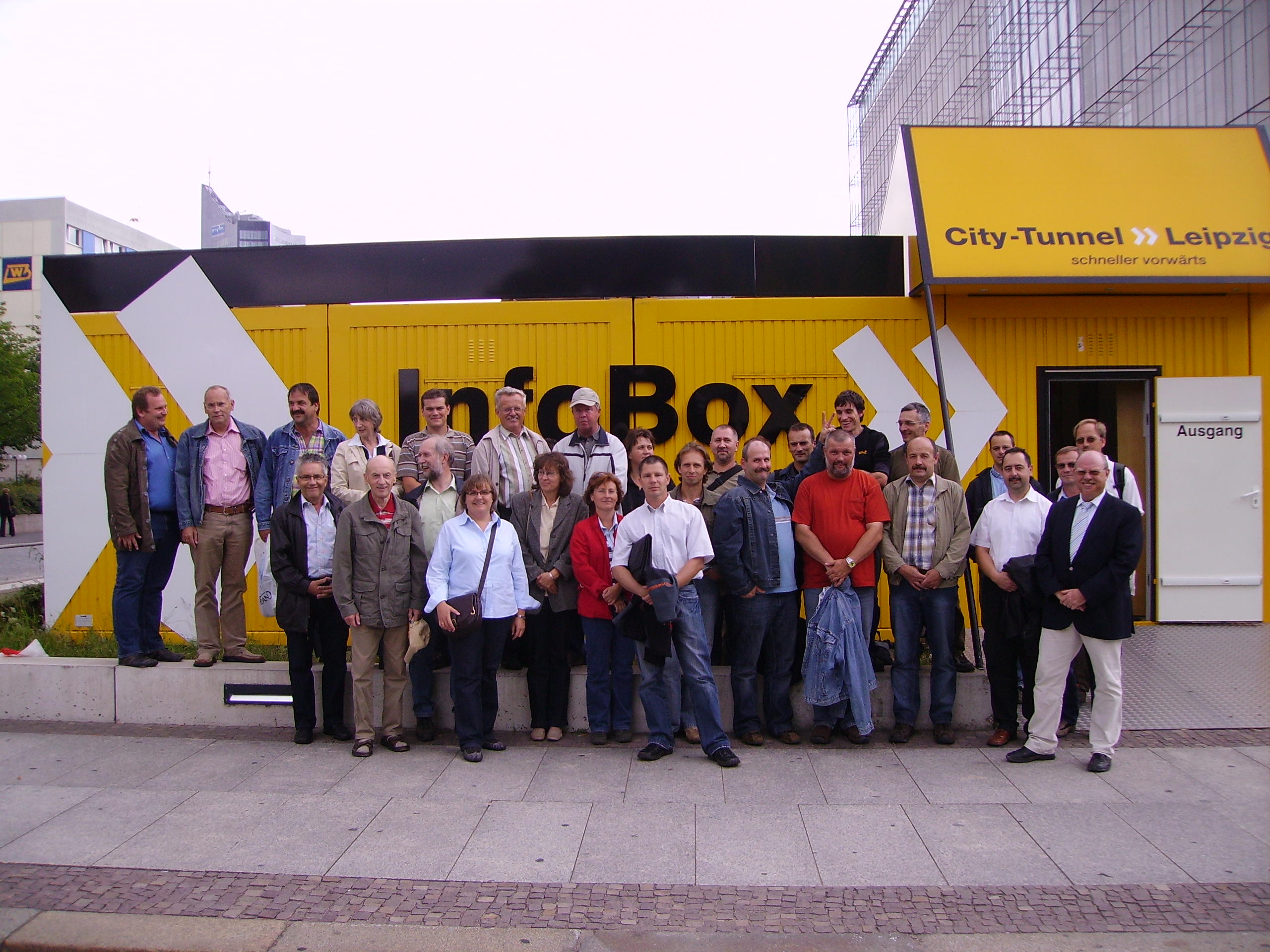 Der VDV Bezirk Leipzig wurde durch den Landesvorstand gebeten, eine Landesfachexkursion mit dem über die Stadtgrenzen von Leipzig bekannten Thema City-Tunnel Leipzig zu organisieren. Am 29.06.2007 war es dann soweit. Der Bezirk Leipzig hat zur Landesexkursion in die Messestadt eingeladen. Um 15.00 Uhr hatte sich eine 25-köpfige Delegation am Informations-Baucontainer des Bauherrn - DEGIS - eingetroffen. Im erster Vortrag des Bauherrn wurde einen Überblick über das ehrgeizige, aber auch bei den Bürgern in Leipzig umstrittene Projekt in der Messestadt gegeben. Die DEGIS hat hier umfangreiche Informationen über Sicherung, Bauablauf, Organisation und zeitlichen Ablauf der Baustellen gegeben. So mussten z.B. die oberirdischen Arbeiten für die einzelnen Haltestellen des Tunnels bis zur FIFA-Fußball-Weltmeisterschaft bis Juni 2006 abgeschlossen sein, so dass der Boden verfüllt und die Straßenzüge für den Verkehr wieder freigegeben werden konnten. Der Besucher der nach der Olympiade zweitgrößten Sportveranstaltung der Welt hat gar nicht gemerkt, dass sich quer durch die Stadt eine Großbaustelle befindet. Auch die Bohrmaschine, die auf den Namen Leonie getauft wurde, ist anhand des im Baucontainer aufgestellten Modells ausreichend erläutert worden. Leider war eine Besichtigung der Bohrmaschine im Einsatz nicht möglich. Zum Zeitpunkt der Exkursion befand sich Leonie in der Schleuse am Ende der ersten gebohrten Röhre kurz vor dem Durchbruch in die Haltestelle Wilhelm-Leuschner-Platz. Es wurde unter anderem auch der über 100 jährige unerfüllten Traum der Stadtplaner von Leipzig und die Geschichte des Tunnelbaus erörtert. Wer hätte gedacht, dass in einer ersten Lösung für eine Verbindung, der in Leipzig getrennt liegenden Bahnhöfe zwischen Anhalter, Thüringer- Sächsischem Bahnhof, dem heutigen Hauptbahnhof, und dem südöstlich gelegenem Bayrischem Bahnhof eine Hochbahn über die Innenstadt geplant war.