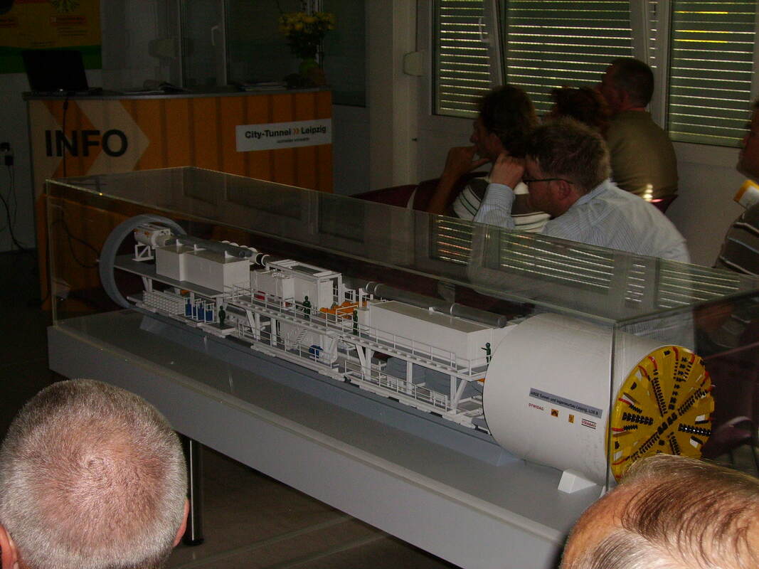 Der VDV Bezirk Leipzig wurde durch den Landesvorstand gebeten, eine Landesfachexkursion mit dem über die Stadtgrenzen von Leipzig bekannten Thema City-Tunnel Leipzig zu organisieren. Am 29.06.2007 war es dann soweit. Der Bezirk Leipzig hat zur Landesexkursion in die Messestadt eingeladen. Um 15.00 Uhr hatte sich eine 25-köpfige Delegation am Informations-Baucontainer des Bauherrn - DEGIS - eingetroffen. Im erster Vortrag des Bauherrn wurde einen Überblick über das ehrgeizige, aber auch bei den Bürgern in Leipzig umstrittene Projekt in der Messestadt gegeben. Die DEGIS hat hier umfangreiche Informationen über Sicherung, Bauablauf, Organisation und zeitlichen Ablauf der Baustellen gegeben. So mussten z.B. die oberirdischen Arbeiten für die einzelnen Haltestellen des Tunnels bis zur FIFA-Fußball-Weltmeisterschaft bis Juni 2006 abgeschlossen sein, so dass der Boden verfüllt und die Straßenzüge für den Verkehr wieder freigegeben werden konnten. Der Besucher der nach der Olympiade zweitgrößten Sportveranstaltung der Welt hat gar nicht gemerkt, dass sich quer durch die Stadt eine Großbaustelle befindet. Auch die Bohrmaschine, die auf den Namen Leonie getauft wurde, ist anhand des im Baucontainer aufgestellten Modells ausreichend erläutert worden. Leider war eine Besichtigung der Bohrmaschine im Einsatz nicht möglich. Zum Zeitpunkt der Exkursion befand sich Leonie in der Schleuse am Ende der ersten gebohrten Röhre kurz vor dem Durchbruch in die Haltestelle Wilhelm-Leuschner-Platz. Es wurde unter anderem auch der über 100 jährige unerfüllten Traum der Stadtplaner von Leipzig und die Geschichte des Tunnelbaus erörtert. Wer hätte gedacht, dass in einer ersten Lösung für eine Verbindung, der in Leipzig getrennt liegenden Bahnhöfe zwischen Anhalter, Thüringer- Sächsischem Bahnhof, dem heutigen Hauptbahnhof, und dem südöstlich gelegenem Bayrischem Bahnhof eine Hochbahn über die Innenstadt geplant war.