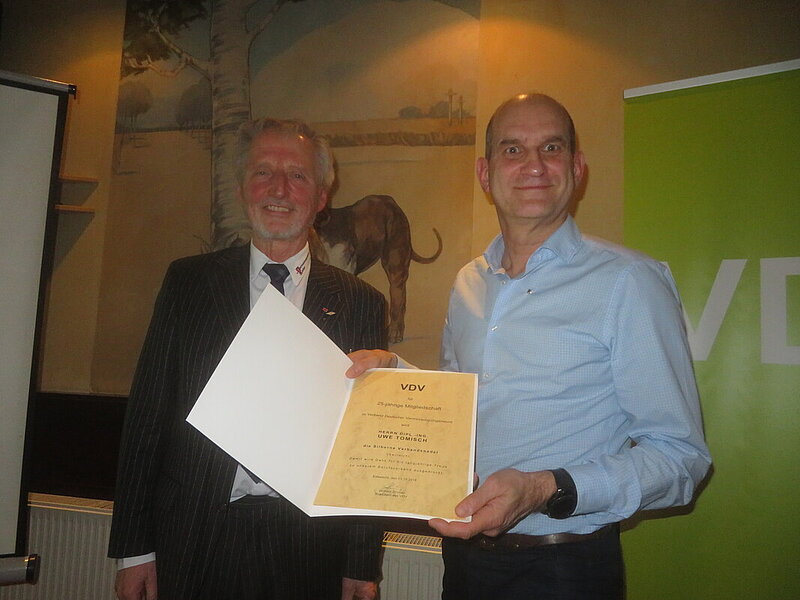 Die Herren Uwe Tomisch und Axel Hense wurden mit der Silbernen Verbandsnadel für 25-jährige Mitgliedschaft im VDV geehrt.