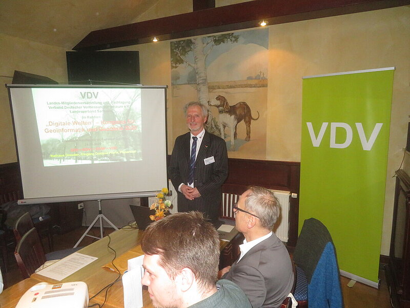 Matthias Kaden begrüßte 21 anwesende VDV-Mitglieder des Landesverbandes Sachsen sowie den Vertreter des Bundesvorstandes Burkhard Kreuter (VDV Geschäftsführer), Peter Boxberger (Vorsitzender der BDVI Landesgruppe Sachsen), die Vertreter der benachbarten VDV Landesverbände Gerald Heilwagen (Vorsitzender im Freistaat Thüringen), Achim Dombert (Vorsitzender in Sachsen-Anhalt) und Matthias Grote (Vorsitzender in Berlin/Brandenburg).
