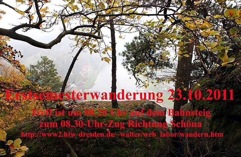 Alle VDV-Mitglieder sind herzlich zur alljährlich Erstsemesterwanderung am kommenden Sonntag, den 23.10.11 eingeladen. Ziel der Veranstaltungen ist es, die neue Studenten die Möglichkeit zu geben, Studierenden aus anderen Seminargruppen im gleich oder älteren Jahrgangs sowie Personal und Kollegen aus der Praxis in einer lockeren Atmosphäre kennenzulernen. Treffpunktdetails sind unten ersichtlich, weiteres gibt es unter http://www2.htw-dresden.de/~walter/web_labor/wandern.htm