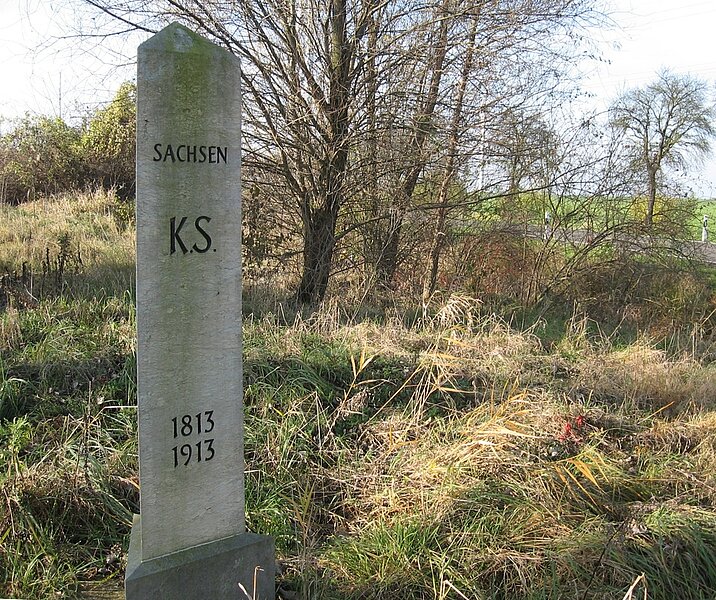 Nach dem Krieg gegen Napoleon wurden die Grenzen in Europa 1813 neu festgelegt. Die Grenzmarkierungen wurden aber erst 1818 gesetzt. So erhielt auch dieser markanten Punkt einen ersten Grenzstein. An der Grenzsäule hier trafen damals die Königreiche Sachsen und Preußen und das Herzogtum Sachsen-Altenburg aufeinander. Im Oktober 1913 zum 100 Jahrestag der Befreiung vom Napoleonischen Joch wurde ein neuer Grenzstein gesetzt. Dieser war dreikantig und eingemeißelt waren die Initialen H.A. (Herzogtum Altenburg), K.S. (Königreich Sachsen) und K.P. (Königreich Preußen) und die Jahreszahlen 1813 und 1913.