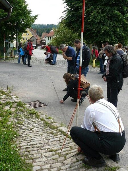 In Zusammenarbeit mit dem ortsansässigen Thüringer Freilichtmuseum Hohenfelden organisierte ÖbVI Dipl.-Ing. Falko Hüter diesen „Außendienst“. Geladen waren nicht nur die Mitglieder der Berufsverbände BDVI, DVW und VDV, sondern auch alle interessierten Einwohner und Gäste von Hohenfelden und Umgebung. Die historische Vermessungsausrüstung und ein schier unerschöpfliches Fachwissen stellte Dipl.-Ing. Falk Zimmányi zur Verfügung. Mit Fluchtstangen, Doppelwinkelprisma und Messband konnte jeder Interessierte am Aufbau der Messungslinie mitwirken. Schließlich wurden der historische Grenzstein und einige Gebäudeecken aufgemessen. Begriffe wie Abszisse, Ordinate oder Strebe wurden an dem Tag häufig gebraucht. Sie sind den Fachleuten noch geläufig, aber in der täglichen Vermessungspraxis kaum noch im Sprachgebrauch. Alle Maße wurden säuberlich dokumentiert, rechnerisch geprüft und konnten dann mit den historischen Vermessungsrissen verglichen werden. Für eine Winkelmessung standen auch alte Nonientheodolite zur Verfügung, die aber nicht zum Einsatz kamen. Hier reichte den meisten Besuchern ein Blick durch das Fernrohr auf die Kirchturmspitze.