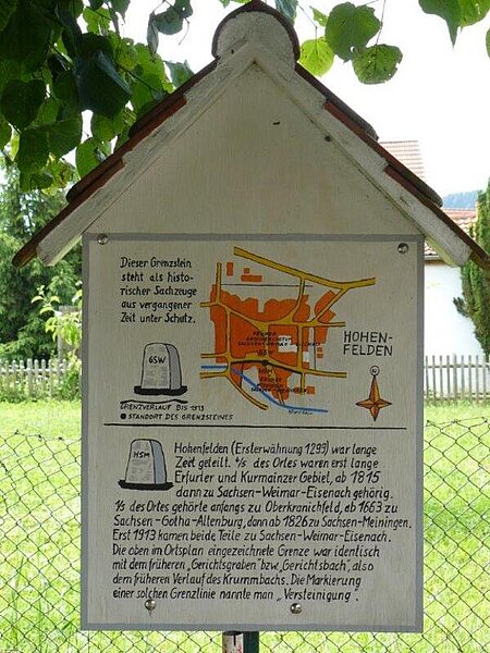 Der Thüringer Ort Hohenfelden im Kreis Weimarer Land war lange Zeit zweigeteilt. Ein historischer Grenzstein zeugt noch heute von den wechselnden Herrschaften auf beiden Seiten der Grenze. Mitten durch den Ort verlief die Landesgrenze zwischen dem Herzogtum Sachsen - Meiningen und dem Herzogtum Sachsen-Weimar-Eisenach. Erst 1913 wurde die Teilung aufgehoben. An dieses Ereignis vor 100 Jahren erinnerte eine historische Vermessung am 30. Juni 2013.