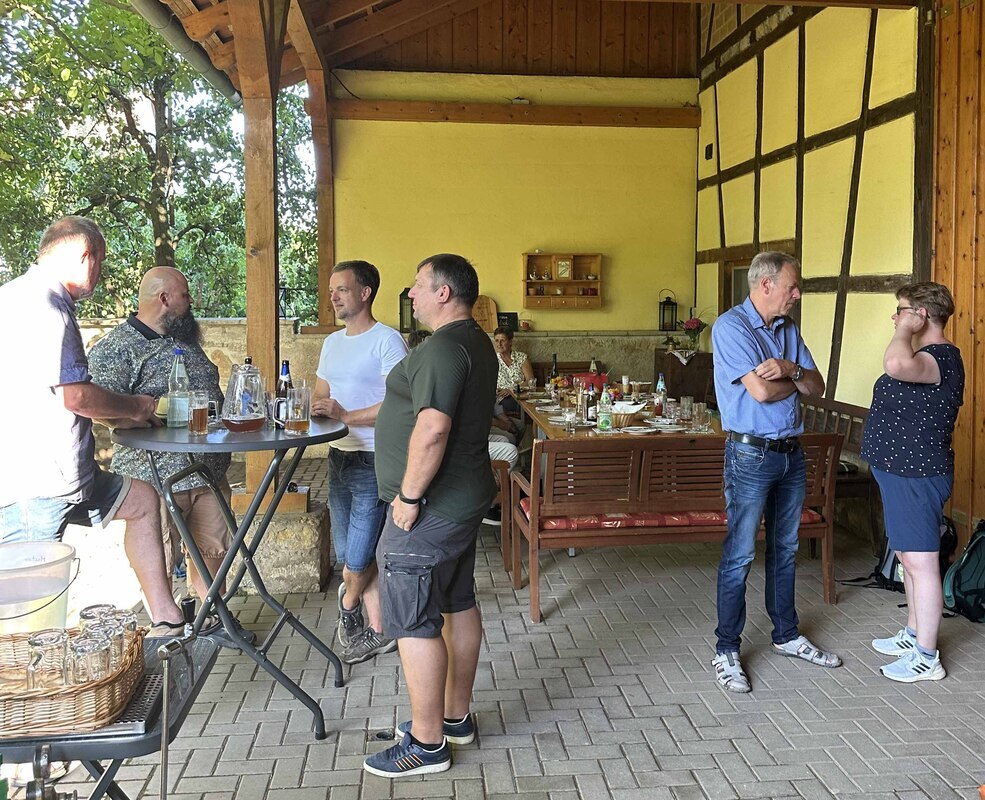 Danach ging es zum gemütlichen Teil über. Mit Thüringer Grillspezialitäten vom Rost und selbstgemachten Salaten ließen es sich die Gäste bei bester Sommerlaune schmecken. Vor allem aber das köstliche selbstgebraute Bier des „Brau- und Kulturvereins Thüringer Freilichtmuseum Hohenfelden e. V.“ floss reichlich. Da am Ende nicht mehr alle Gäste „fahrtauglich“ waren, wurde zu später Stunde noch eine Buslinie von Hohenfelden nach Erfurt herausgesucht. Der Busfahrer muss sich über das „hohe“ Fahrgastaufkommen gewundert haben. Natürlich hatte Familie Hüter wieder viel zu üppig für das leibliche Wohl gesorgt, aber deshalb kommen wir ja auch in jedem Jahr gerne wieder nach Hohenfelden. Ein großer Dank geht nochmal an alle Beteiligten, die für ein rundum gelungenes Sommerfest des VDV-Landesverbandes Thüringen gesorgt haben.