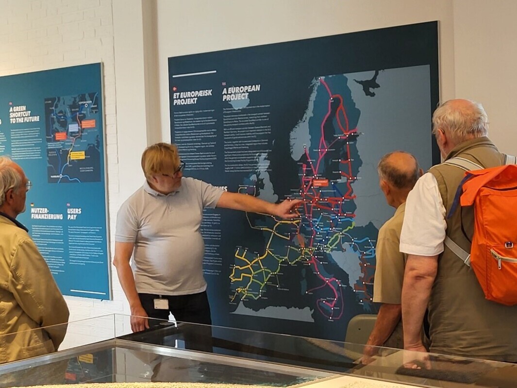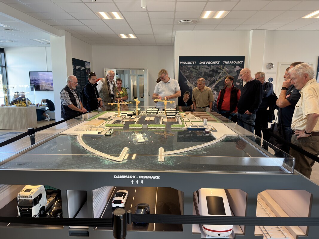 Von unserem Guide Jesper Christian wurden wir herzlich empfangen und sogleich in das Thema „Nordeuropas größtes Infrastrukturprojekt und längster Absenktunnel der Welt“ eingeführt. Er ist wesentlicher Bestandteil des europäischen Verkehrsnetzes und verkürzt die Reisezeiten nach Skandinavien. Der Transitverkehr spart einen Umweg von etwa 160 km ein. Die Zugfahrt von Hamburg nach Kopenhagen mit den modernsten Elektrozügen wird von ca. 5 Stunden auf 2,5 Stunden halbiert.
