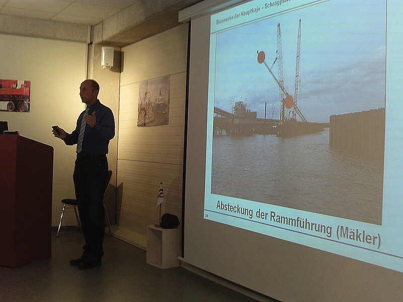 Nach einem Mittagsimbiss und vielen interessanten Gesprächen informierten Herr Dipl.-Ing. Marc Böttjer von der Ingenieurgesellschaft Nordwest über die landseitige Vermessung und Herr Dipl.-Ing. Jörg Brunken vom Geo Ingenieurteam über die seeseitige Vermessung des Großprojektes.