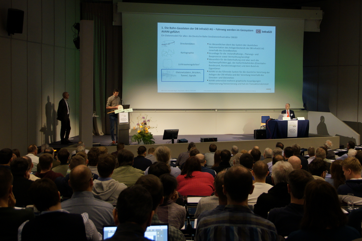 Gestartet wurde das Fachprogramm mit einem Doppelvortrag „Geodatenmanagement im Umfeld von AVANI – Der universelle Datenaustausch“ durch Alexander Nagel und Jörg Giebel (beide DB InfraGO AG). Im ersten Teil stellte Alexander Nagel kurz das Geosystem AVANI vor, mit dem die Bahn-Geodaten der DB InfraGO AG als eine räumliche Dokumentation des Anlagenbestands vorgehalten werden. Aus AVANI (Analyse, Verwaltung und Abgabe der DB InfraGO.GeoInformationen) können verschiedene Produkte generiert werden, außerdem dient dieses raumbezogene System als „Drehscheibe“ zu staatlichen Stellen (BKG, Innenministerien und weitere Behörden). Solch ein Geodatensystem muss permanent laufendgehalten werden, damit aktuelle Daten verfügbar sind. Das Geodatenmanagement erfolgt mit dem GAT (GeoAnalyseTool), wichtigste Bestandteile sind der Datenbank Server und der Application Server mit den Quelldaten, dem User Frontend, der Automation für Daten- sowie Produkterstellung und den erforderlichen Schnittstellen. Herzstück der Anwendungen sind der FME-Server, mit dem der Datenex- und -import umgesetzt wird. Der Datenaustausch erfolgt dabei bidirektional. Eine externe Datenpflege außerhalb des Systems mit entsprechenden Tools ist somit möglich. Das Einpflegen der aktualisierten Daten erfordert Prüfprozesse, um die Datenkonsistenz im AVANI zu gewährleisten. Eine erste Anwendung für den bidirektionalen Datenaustausch wurde bei der Generalsanierung der Riedbahn pilotiert. Die erforderliche Datenabgabe erfolgte im Januar 2025, die Daten wurden mit den Ergebnissen aus der fahrzeuggestützten Erfassung (Multisensorsystem) verschnitten und werden im zweiten Quartal 2025 in das System zurückgeführt. Die Datenmigration wird mit einem hohen Grad an Automation umgesetzt. Dazu sind aber noch praktische Klärungen nötig, z. B. für die Übernahme der aufgemessenen LWL-Kabel. Es sind in diesem Jahr noch etliche weitere praktische Fragen abzustimmen, um eine automatische Übernahme zu gewährleisten. Ein Mehrwert des Verfahrens besteht darin, dass Aufwand und Komplexität der Datenaufnahme (z. B. durch Messfahrten) gesenkt werden. Künftig soll es einfacher sein, ganze Bereiche automatisiert aufzunehmen und die Auswertung über Bilderkennung und KI vorzunehmen. Damit kann der zeitliche Aufwand für den Außendienst spürbar gesenkt werden.