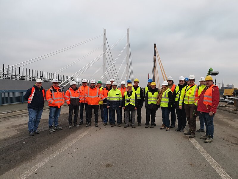 Bei schönstem Wetter begaben sich die Teilnehmer nach der Projektvorstellung auf eine 90-minütige Baustellen-Exkursion, um sich das eindrucksvolle neue Bauwerk mit seinen imposanten Pylonen, sowohl von unten als auch auf der Brücke anzuschauen.