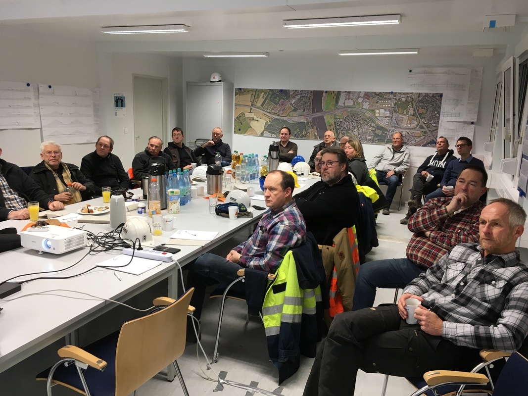 Fachgruppenleiter Volker Schultheiß begrüßte im Projektbüro der Bauleitung „ARGE A 40 Rheinbrücke“ insgesamt 21 interessierte Teilnehmerinnen und Teilnehmer zu diesem Seminar.