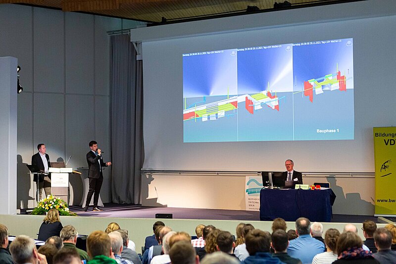 Den zweiten Vortrag hielten Maximilian Borth und Joshua Grzeskowiak (beide DB Engineering & Consulting GmbH, Berlin) zum Thema „Vom Bestandsmodell zur 4D-Simulation“ (Abb. 4). Die Referenten stellten ihr BIM-Thema am konkreten Beispiel von Brückenbauwerken (Ersatzbauwerke) in Bernau vor. Nach der Projektvorstellung wurde als erstes die 3D-Bestandaufnahme und Bestandsmodellierung als Basis für die weitere Planung im Detail erläutert. Dafür wurden neben verfügbaren Bestanddaten (IZ Plan der DB sowie Datenmodelle der Landesvermessung) eine klassische 3D-Bauwerksvermessung und ein Laserscanning der Bestandsbauwerke durchgeführt. Damit lag ein komplexes Digitales Geländemodell (DGM) als Grundlage für BIM vor. Ergebnis der Qualitätssicherung war, die Passgenauigkeit der einzelnen Bestandteile lag unter 3 cm. Darauf aufbauend wurden Fachmodelle für die Planung erstellt. Das betraf neben dem Oberbau und der Leit- und Sicherungstechnik (LST) weitere Fachgewerke. Das BIM-Projekt diente anschließend als Grundlage für die Bauablaufplanung. Dafür waren die Hauptbauphasen mit den erforderlichen Arbeitsschritten im Modell zu definieren. Eindrucksvoll demonstrierten die Referenten in einer Terminplanvisualisierung (Verknüpfung von Bestandsmodell und Bauablaufplanung) wie die einzelnen Bauphasen ablaufen werden. Hier zeigt sich der unstrittige Vorteil eines komplexen Bauwerksmodells. Durch Kollisionprüfungen in der Bautechnologie lassen vor der Bauausführung kritische Stellen erkennen. Mit einer Bewertung bautechnologischer Zusammenhangsmaßnahmen war eine weitere Optimierung der Bauausführung möglich. Die Terminplanung bzw. die weitere Entwicklung der Bautechnologie sollen künftig unmittelbar am Modell erfolgen. Dieses wird bis zu einer (teil)automatisierten Terminplanung weitergeführt.