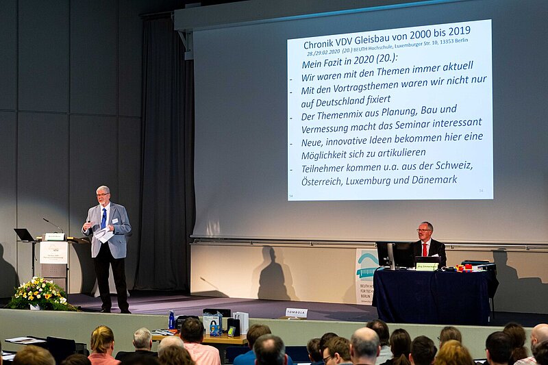 Eine Sonderstellung hatte der Vortrag „Rückblick auf 20 Jahre Gleisbauseminar“ in der abschließenden Session. Berndt Weise stellte mit seiner Erfahrung als Hauptorganisator des Seminars über sehr viele Jahre die Entwicklung dieser erfolgreichen Veranstaltung in den vergangenen 20 Jahren vor (Abb. 7). Dazu hatte er eine Unmenge von Daten und Fakten zusammengetragen und mit prägnanten Bildern untersetzt. Der Verfasser möchte an dieser Stelle seinen persönlichen Dank an Berndt Weise für diesen Vortrag aussprechen! Verwiesen sei hier auf Beitrag „VDV Gleisbau Berlin: 20 interessante Jahre“ vom Referenten im Heft 3/2020 dieser Zeitschrift.