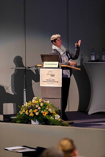 Anschließend stellte Daniela Hofmann (DB Engineering & Consulting, Bremen) mit Ihrem Vortrag „Georadar – Der Blick ins Verborgene“ die Möglichkeiten und Grenzen dieser Technologie vor (Abb. 6). Die Referentin ging zunächst kurz auf das Verfahren Georadar ein. Sie betonte, dass es keine neue Technologie ist und bei der DB bereits seit 1993 angewendet wird. Georadar zählt zu den indirekten Aufschlussmethoden der geotechnischen Untersuchungen (DIN 4020). Das Verfahren ist bei der DB für die Untersuchung des Unterbaus bei klassischem Schotteroberbau zugelassen (Ril 836). In den vergangenen 27 Jahren wurde Georadar permanent weiterentwickelt und ist heute für unterschiedliche Anwendungen verfügbar. Verknüpft werden kann Georadar auch mit anderen Sensoren (z. B. Videokamera oder GPS). Das Verfahren dient in erster Linie der Erhöhung der geotechnischen Sicherheit auf künftigen Baustellen. Für eine zielführende Anwendung sind verschiedene Faktoren ausschlaggebend, dazu gehört vor allem die Wahl der richtigen Antennenfrequenz und des richtigen Auflösungsvermögens. Es folgte die Erläuterung von Anwendungen unterschiedlichster Art, von Schlammstellen im Gleis über die Detektion von Planumsschutzschichten bis hin zur Bewehrungsortung. Abschließend wurden die verschiedenen Entwicklungen im Rahmen von Digitalisierung und BIM kurz vorgestellt.