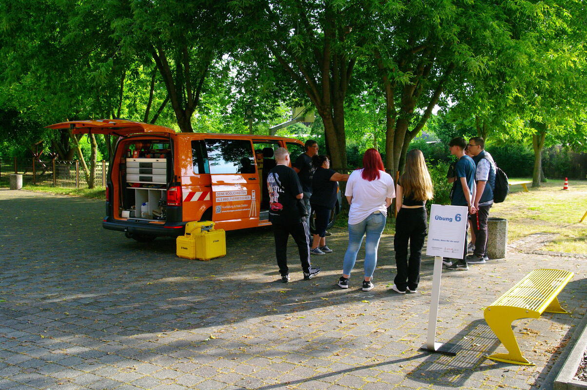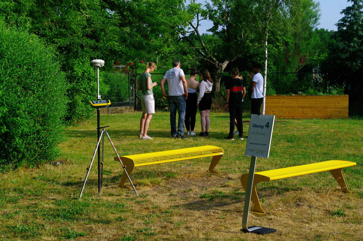 Im Rahmen zweier Schulprojekttage wurden am 20. und 21. Juni 2023 erstmalig in Sachsen-Anhalt rund 70 Schülerinnen und Schülern durch aktive Mitgestaltung an insgesamt 6 Stationen gezeigt, wie vielfältig der Beruf des Geodäten / Geomatiker sein kann. Es wurde bildlich und auch für die Schüler zum Anfassen mit praktischen Übungen erläutert, wie unterschiedlich die Welt erfasst und vermessen wird, wie die erzeugten Geodaten anschließende verarbeitet, analysiert und veredelt und zum Schluss mit digitalen Karten und Geländemodellen diese visualisiert und abgebildet werden. Folgende Übungen wurden jeweils in ca. 40 min. Slots allen Schülern angeboten, wobei jeweils auch Hand angelegt werden konnte: