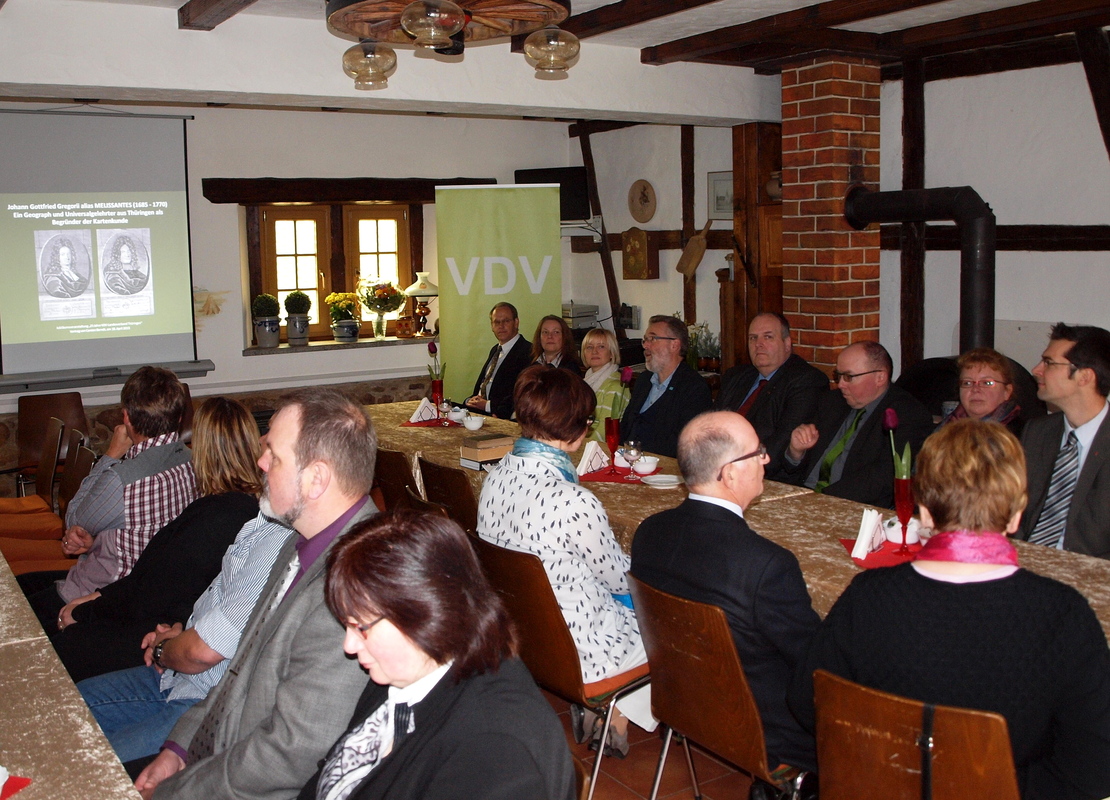 Der Landesvorstand wählte den geschichtsträchtigen Bach-Ort Dornheim für sein Jubiläum. Feierliche Orgelmusik eines jungen Musikschülers aus Hohenfelden gab der Veranstaltung in der Traukirche einen würdigen Rahmen. Der Landesvorsitzende begrüßte den DVW-Präsidenten Prof. Dr. Karl-Friedrich Thöne, den DVW-Landesvorsitzenden Dirk Mesch und seinen Stellvertreter Claus Rodig, den Vorsitzenden der BDVI-Landesgruppe Thüringen, Torsten Hentschel, von der DGfK-Sektion Thüringen, Kerstin Smuda, sowie Gunter Lencer von der Ingenieurkammer Thüringen. Der Einladung nach Thüringen sind weiterhin der VDV-Landesvorsitzende von Sachsen-Anhalt, Achim Dombert und der VDV-Geschäftsführer Burkhard Kreuter gefolgt. Herzliche Grüße des VDV-Präsidenten Wilfried Grunau, des Vizepräsidenten Klaus Meyer-Dietrich und des VDV-Landesvorsitzenden von Sachsen Matthias Kaden wurden überbracht.