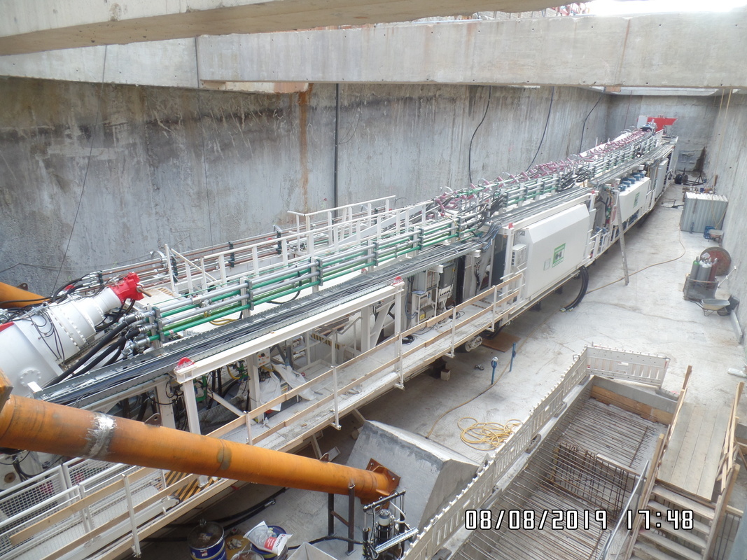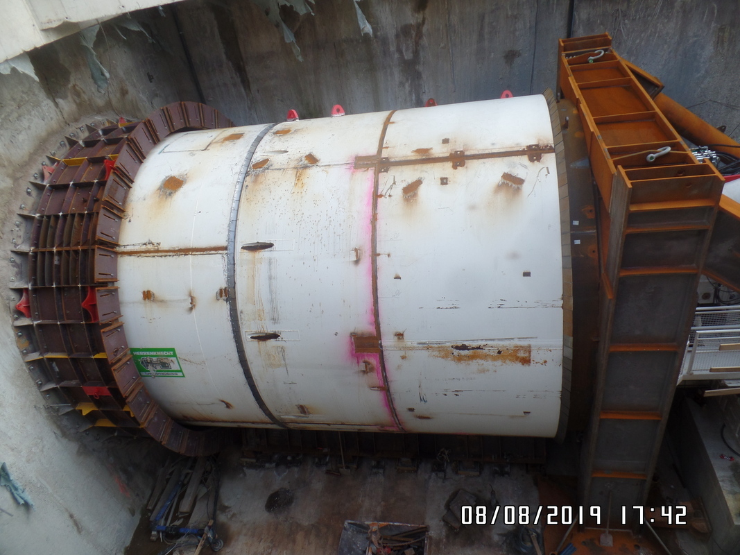 Bei unserem Besuch wurden wir zunächst von Mitarbeitern der ausführenden Baufirmen herzlich empfangen. Im Baubüro wurde uns zunächst das Bauprojekt im Allgemeinen vorgestellt und dann über den aktuellen Baufortschritt informiert. Danach ging es mit entsprechender Schutzkleidung ausgestattet über die Baustelle mit all ihren Einrichtungen und Gerätschaften (unter anderem eine Rettungskammer) zur 18 Meter tiefen Startbaugrube, in der die Tunnelvortriebsmaschine montiert wird. Zum Zeitpunkt unseres Besuches war die Endmontage fast abgeschlossen, so dass wir die Maschine nahezu komplett ausgiebig in Augenschein nehmen konnten. In diesem Zusammenhang war interessant zu erfahren, dass zwei Mitarbeiter der Herstellerfirma die Maschine ohne Montageplan also sozusagen "aus dem Kopf heraus" zusammenbauen.