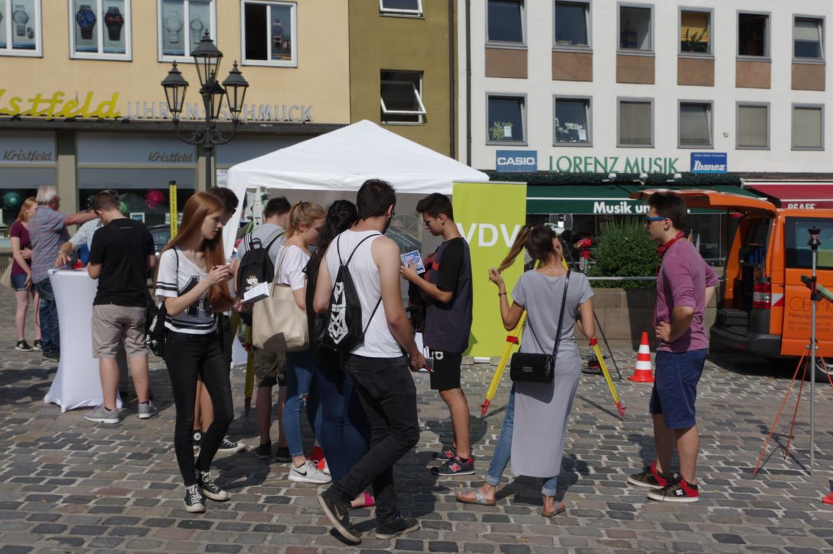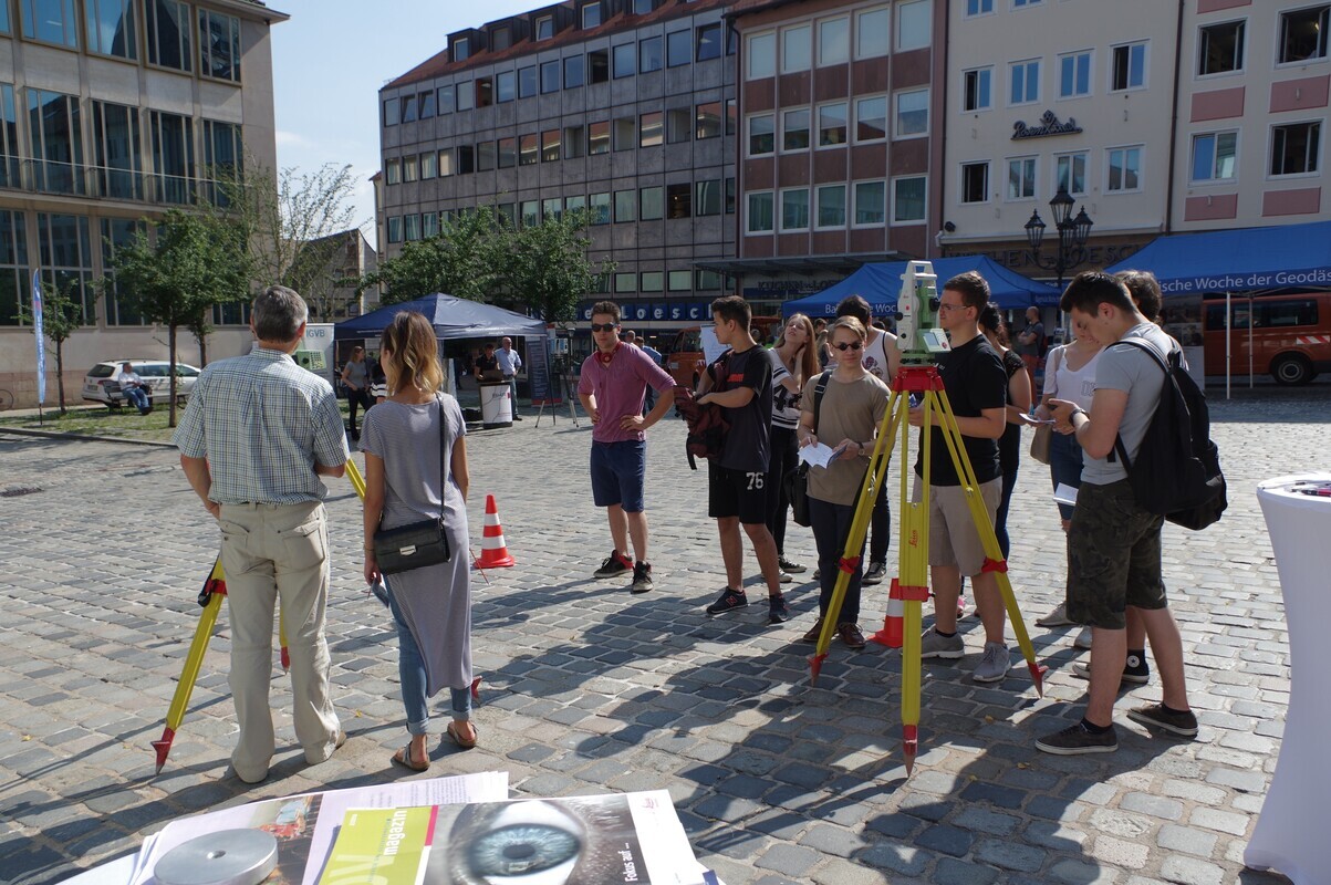 Am 18. Juli 2016 fand in Nürnberg die Auftaktveranstaltung zur diesjährigen „Bayerische Woche der Geodäsie“ statt. Kern dieser Veranstaltung war es, Schülern weiterführender Schulen die Möglichkeit zu geben, das Berufsfeld des Geodäten in all seinen verschiedenen Bereichen kennenzulernen und somit das Interesse an einem entsprechenden Studium oder einer Ausbildung zu wecken. So wurden im Vorfeld der Veranstaltung Informationen an die Schulen der Metropolregion Nürnberg verteilt. Zahlreiche Klassen folgten der Einladung und wurden dann durch ein GPS-Handgerät zu den einzelnen Ständen geführt, wo Sie mit einem GeoQuiz spezielle Fragen beantworten mussten, dass als Lösungswort das diesjährige Motto „Wir vermessen die Welt“ ergab.