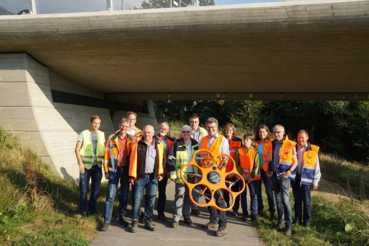 Nach einem kleinen Ortswechsel verbunden mit dem Anlegen von Sicherheitsschuhen und -bekleidung ging es bei schönem Wetter auf die eigentliche Baustelle. Dort konnten alle Teilnehmer sich über den bisherigen laufenden Baufortschritt einen Eindruck verschaffen. Trotz des späten Freitagnachmittags waren noch Bauarbeiten mit einem Gräder zu sehen. Mit dem theoretischen Wissen und den ausführlichen Erläuterungen vor Ort verließen die Teilnehmer die Baustelle. Es bleibt festzustellen, dass noch viele UAV-Projekte Unikate sind und viel individuelles Fachwissen erfordern. Nach Abschluss der Veranstaltung mit dem gemeinsamen Foto unter dem Brückenbauwerk Nonnenbachtal wurde dem Ingenieurbüro Bertels einen großen Dank ausgesprochen für einen interessanten und lehrreichen Einblick in die Welt der Bauvermessung mittels UAV.