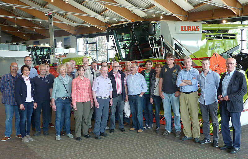 Ein Rundgang durch die Produktionshallen ermöglichte einen Einblick in die Montage der Großgeräte. In den einzelnen Montagelinien werden die Maschinen individuell nach Kundenwunsch montiert. Der Rundgang endete im TechnoParc. Anhand von historischen Geräten konnte hier die über 100 jährige Geschichte der Firma CLAAS nachvollzogen werden.