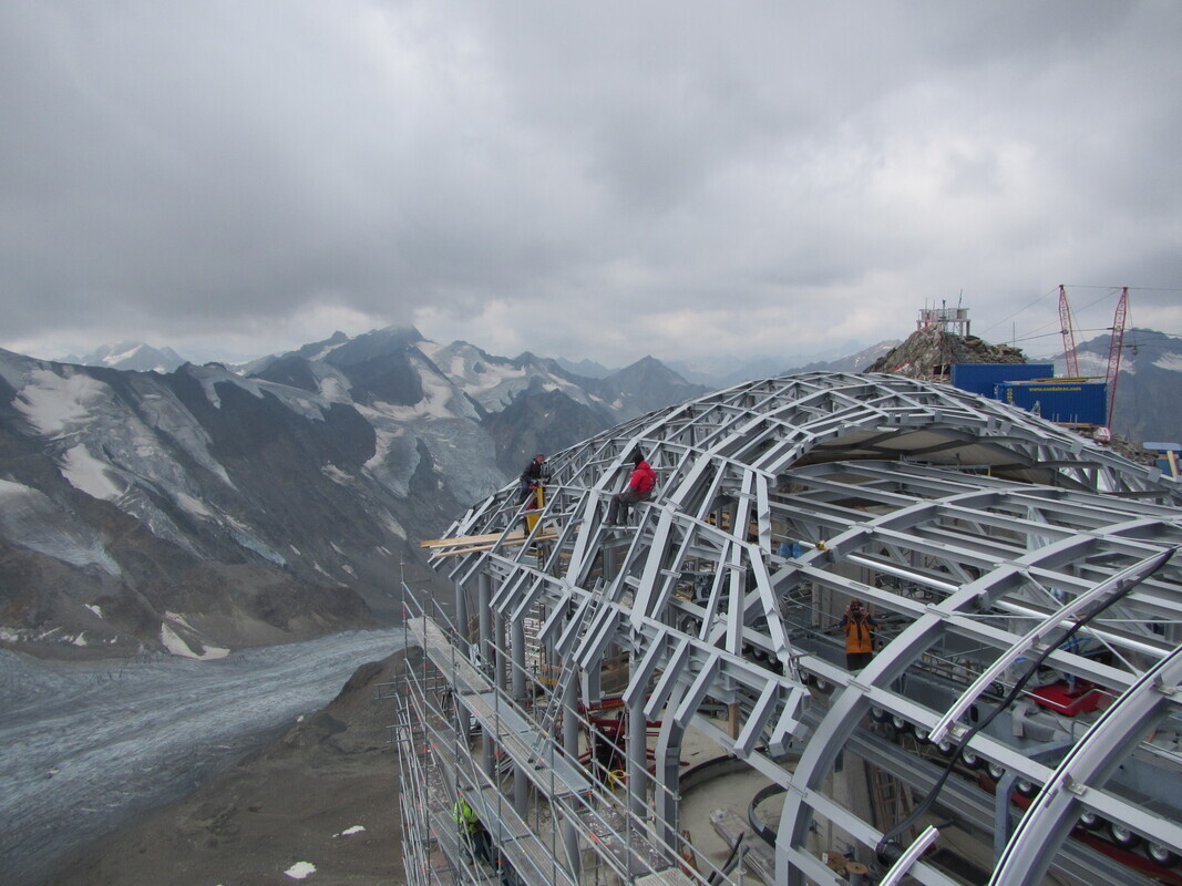 Innerhalb von 6 Monaten wurde auf 2.800 m eine neue Tal- und auf  3.440 m  eine neue Bergstation für die Wildspitzbahn errichtet. Ein paar kleine Fakten dazu: Die tägliche Anfahrt zur Baustelle betrug je nach Wetter und Transportkapazität mit Lift, Pistenraupe oder ATV 1 - 2 Stunden. Schneeeinbrüche mit Minusgraden bis in den August hinein erschwerten die Arbeiten und die Baustelle war so klein, dass Container, Minibagger  und anderes Baugerät nicht drumherum weggefahren werden konnten, sondern mit dem Kran umgesetzt werden mussten, wenn Sie im Weg standen.