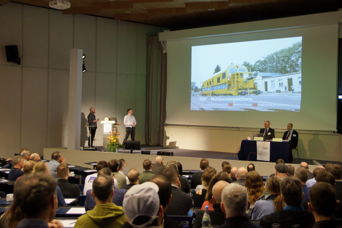 Als erste Vortragende erläuterten Albrecht Vaatz (DB BahnbauGruppe) und Georgios Malissiovas (DB InfraGO AG), welchen Entwicklungsstand die 360°-Multisensorplattform (MSP) aufweist. Ihr Beitrag „360°-Multisensorplattform – Einblick in die Praxis der gleisgebundenen Messdatensammlung“ war der praktischen Anwendung dieses Systems gewidmet. Die 360°- Multisensorplattform ist ein Kooperationsprojekt von DB BahnBau Gruppe und DB Engineering & Consulting. Trägerfahrzeug ist ein EM-SAT 120 (Plasser&Theurer) der DB BahnBau Gruppe, auf dem die MSP und das Georadar montiert sind. Eine erste Vorstellung dieser seit 2022 zertifizierten Technologie erfolgte durch René Dumitsch (DB Engineering & Consulting GmbH) beim Online-Seminar „Gleisbau 2021“. 2025 stand die praktische Anwendung im Mittelpunkt. Mit dem System ist eine gleisgebundene Vermessung und Bestandserfassung zur Digitalisierung der Eisenbahninfrastruktur mit einer Arbeitsgeschwindigkeit von bis zu 80 km/h möglich. Dadurch ist eine schnelle und präzise Erfassung der Gleisinfrastruktur in hoher Qualität bei minimaler Beeinträchtigung des Bahnbetriebs gegeben. Das Konzept beinhaltet als Komplett-Paket die Erfassung, Auswertung und Bereitstellung der Daten für den Auftraggeber. Was liegt als Ergebnis vor: