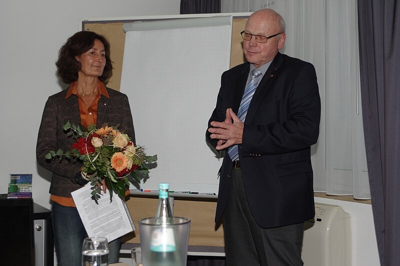 Nach dem interessanten Vortrag bedankte sich der Landesvorsitzende Frank Pöhlmann bei Prof. Dr. Martina Klärle. Als Überaschung konnte er ihr noch die Urkunde mit Anstecknadel für die 25-jährige Mitgliedschaft im VDV überreichen.