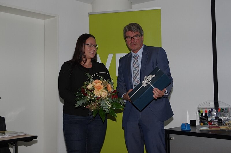 Der Landesvorsitzende Frank Pöhlmann übergab zum Dank ein Präsent und einen Blumenstrauß. Zudem erhielt Sie noch eine Urkunde mit der silbernen Verbandsnadel für die 25-jährige Mitgliedschaft im VDV.