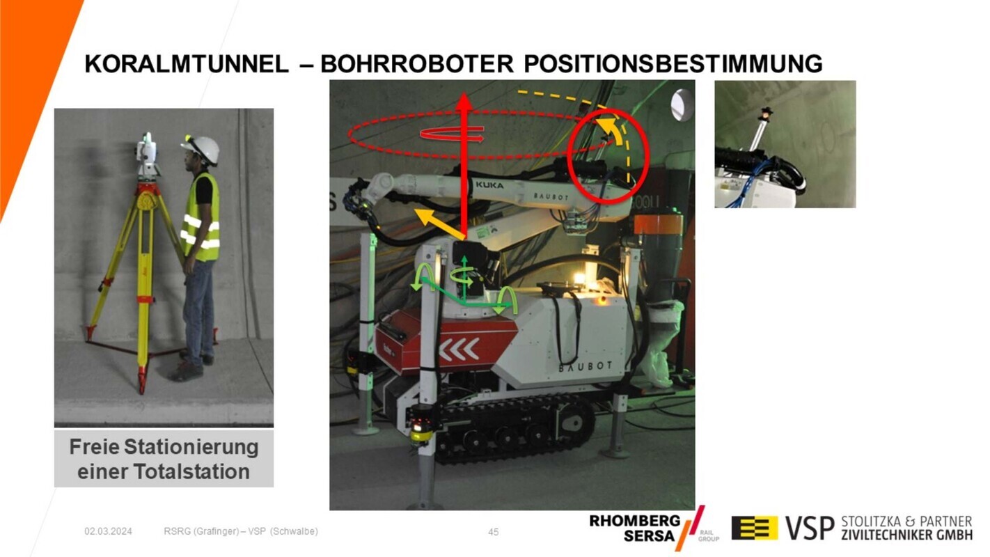 Helga Grafinger (Rhomberg Sersa Rail Group, Villach) und Patrick Schwalbe (VSP Stolitzka & Partner Ziviltechniker GmbH, Wien) stellten mit ihrem gemeinsamen Vortrag „Koralmtunnel – Vermessungstechnische Aufgaben und Lösungen“ Vermessungsaufgaben für die neue Koralmbahn von der Steiermark nach Kärnten in Südösterreich vor. Damit war dieses interessante Großprojekt nach einem Vortrag bei Gleisbau 2011 zum zweiten Mal im Programm. Der 32,9 km lange Koralmtunnel ist neben dem Semmering-Basistunnel (ab 2030) ein wichtiges Teilstück des Baltisch-Adriatischen Korridors im transeuropäischen Eisenbahnnetz (TEN). Seit 2011 hat sich viel getan, inzwischen ist der Tunnel im Rohbau fertig und die Gleise sind verlegt. Momentan erfolgt die bahntechnische Ausrüstung. Die Inbetriebnahme ist aktuell für 2026 geplant. Nach der Projektvorstellung ging Helge Grafinger auf die bautechnischen Aspekte ein. Der Koralmtunnel besteht aus zwei Röhren mit Querschlägen, ist mit fester Fahrbahn und einer Oberleitungsstromschiene ausgestattet. Der Durchstich in beiden Röhren erfolgte Mitte 2010. Für den Vortrieb waren umfangreiche Kontroll- und geotechnische Messungen auszuführen. Beide Röhren wurde im Rohbau mit Scannern erfasst, so dass für Kontrollzwecke ein 3D-Modell verfügbar ist. Im zweiten Teil erläuterte Patrick Schwalbe die speziellen Vermessungsarbeiten. Kernstück waren die Kontrollmessungen für den Bau der Festen Fahrbahn (FF), System ÖBB/PORR. Hierfür wurden alle 13.000 Fugen für die Gleistragplatten an der Tunnelwand abgesteckt. Innerhalb von zwei Jahren erfolgten nach der Feinjustage knapp 500 Betonierfreigaben. Eine weitere spezielle Aufgabe bestand in der Absteckung jedes einzelnen Oberleitungsstützpunktes an der Tunneldecke unter Berücksichtigung von Bohrverbotszonen. Die Abnahme der Oberleitung erfolgte mit einem dynamischen Tunnelscan. Im Ergebnis zeigte sich, dass die Einrichtung der beiden Gleise mit einer Genauigkeit von unter 3 mm erfolgt war. Dadurch waren keine Nachjustierungen erforderlich. Weitere Vermessungsarbeiten betrafen z. B. die Absteckung der Bohrlöcher für die Handläufe mit einem Bohrroboter (Abb. 7). Dafür wurden aus dem Laserscan die Bohrkoordinaten vorausberechnet. Damit konnte diese ansonsten monotone und fehleranfällige Absteckung weitestgehend automatisiert durchgeführt werden.