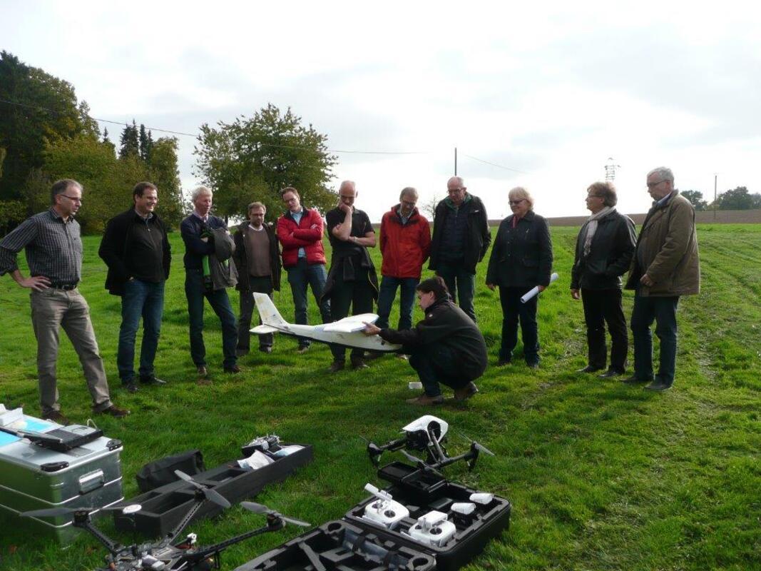 Doch es ging nicht um Spielzeug. Die umstehenden Damen und Herren waren durchweg Vermessungsingenieure, die an einer Fortbildungsveranstaltung des Verbandes Deutscher Vermessungsingenieure, Bezirk Münsterland, teilnahmen. Hier in den Baumbergen informierte der Berufsverband für Geodäsie und Geoinformatik über den Einsatz von „UAV“ im Vermessungswesen. UAV ist dabei die Abkürzung für den englischen Begriff „unmanned aerial vehicle“ – unbemannte Luftfahrzeuge.
